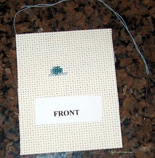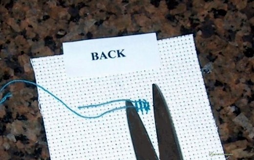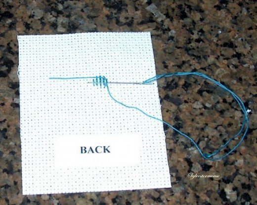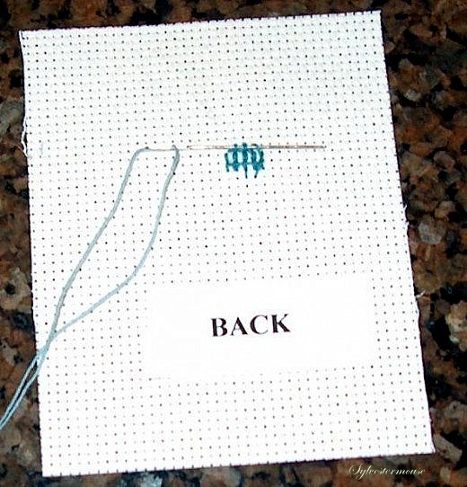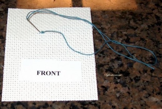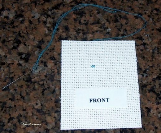 Step 1: Starting your first stitch from the back of the fabric, come up in the desired hole, leaving an inch or more tail in the back. The tail will be tucked behind your finished stitches later so you will not have hanging threads on the back of your finished project.