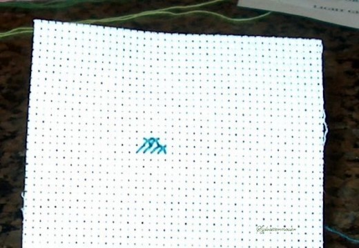 When you are working alone in the future, you will need to choose a color to start that has several stitches on several rows so you will be able to easily see how to fill in around it. The second color to stitch will be the stitches marked . On my example below, I worked the first 4 lines of x stitches before I started with my second color.